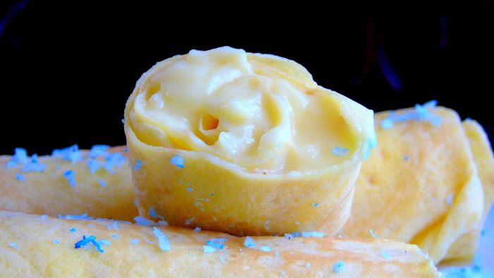 Выкладываем 2 ст.л крема на блин и заворачиваем трубочкой, края перед этим подогнуть...