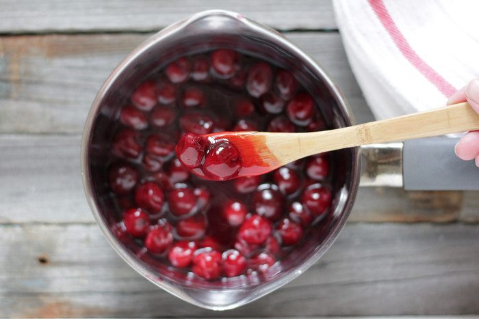Крахмал разведите в 1 ст.л. холодной воды. Приготовьте соус: замороженную вишню выложите в сотейник, добавьте оставшийся сахар, разведенный крахмал, корицу и доведите до кипения, время от времени помешивайте. Как только соус загустеет, снимите с огня.