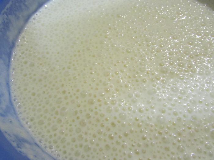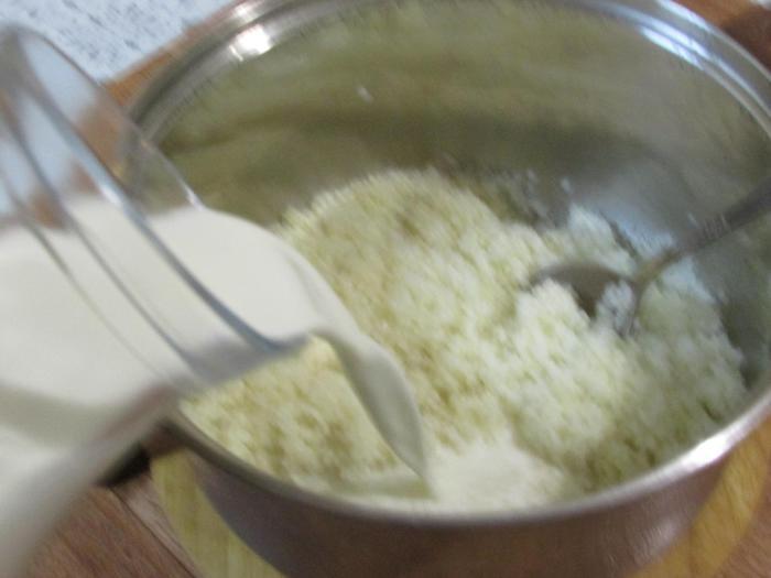Влить постепенно молоко, продолжая взбивать на маленькой скорости.