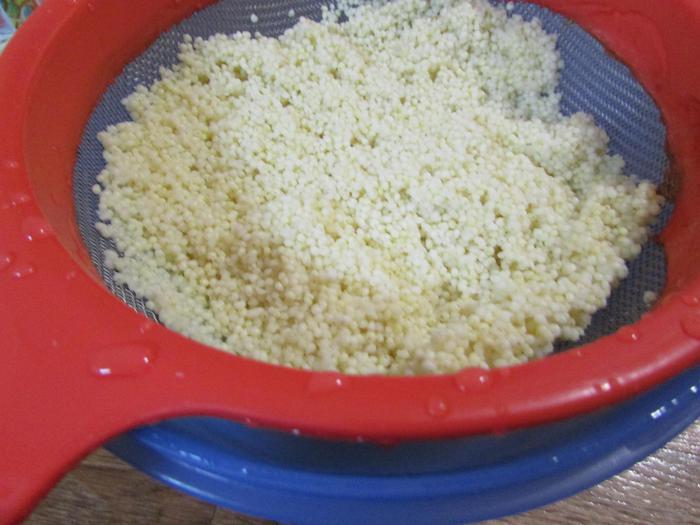 Меняя несколько раз воду, промыть пшено. Затем залить его крутым кипятком и оставить на 5 минут. Затем откинуть на сито и еще раз хорошо промыть.