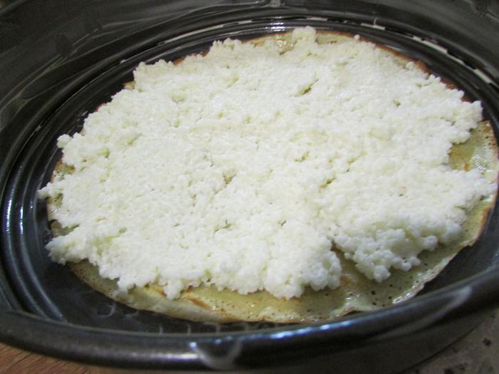 Форму для запекания (хорошо, если форма для запекания и сковорода равны по диаметру) смазать сливочным маслом. Выложить пару блинчиков. Затем — слой каши, снова блинчики. Повторите несколько раз, последним слоем должны быть блинчики.