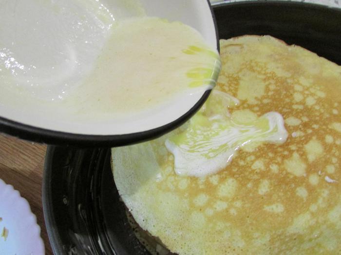 Блинчики выпекать на раскаленной сковородке с обеих сторон. Готовые блинчики смазать сливочным маслом или держать в кастрюльке под крышкой.