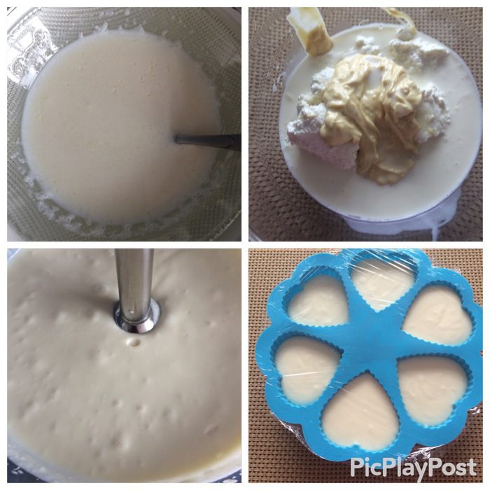 Разливаем в имеющиеся силиконовые формочки. Накрываем пищевой пленкой и отправляем в холодильник до полного застывания, минимум 2 часа.
