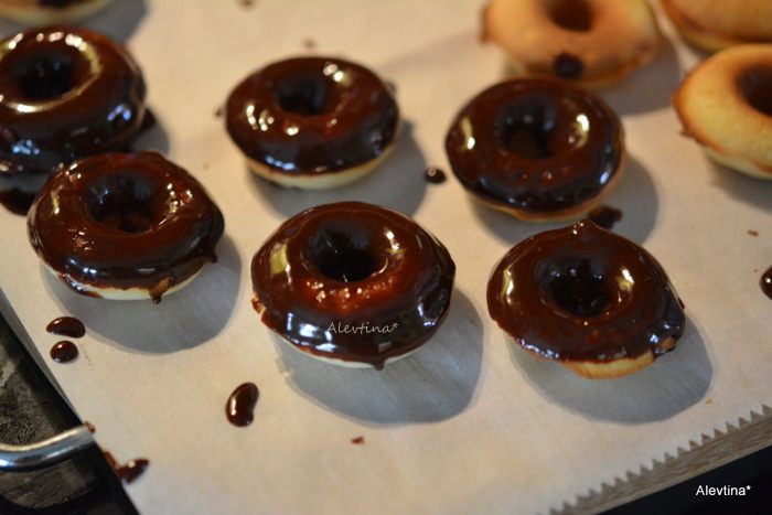 Окунать каждый пончик в шоколад. Выкладывать на противень.