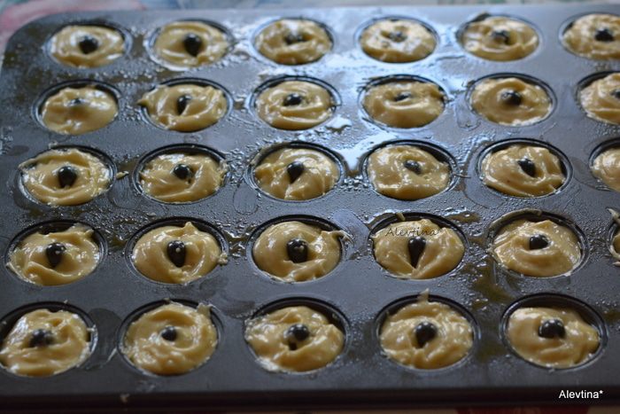 В форму выложить тесто по 1 ст. л. Поставить в духовку разогретую на 7 минут.