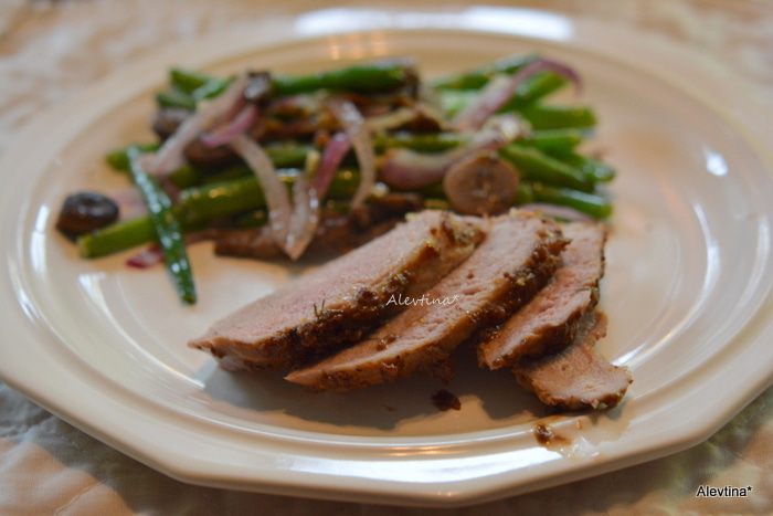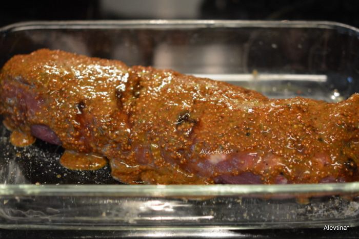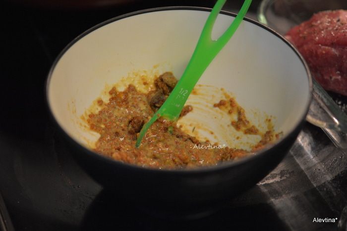 Смазать этой смесью вырезку. Поставить в духовку на 40-45 мин.