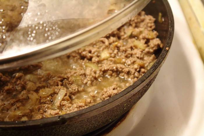 Добавляем фарш, слегка поджариваем, солим и накрываем крышкой. Минут на 5-10, до готовности.
