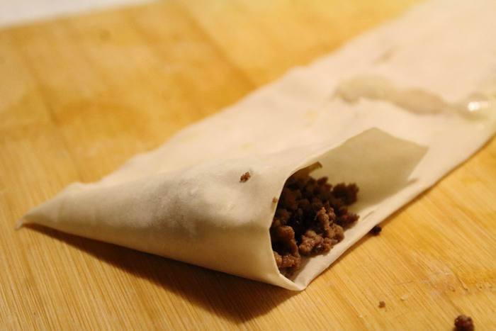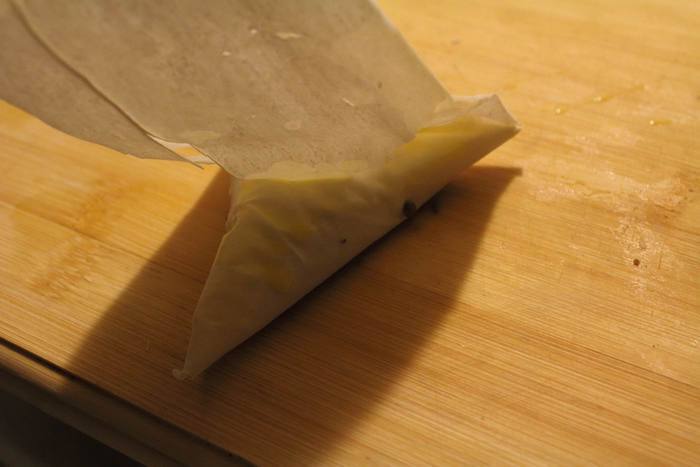 Лист теста фило разрезаем на 4 полоски. Сворачиваем в конус край полосы, укладываем в него начинку (у меня уходила 1 ст.л. в среднем, с горкой)