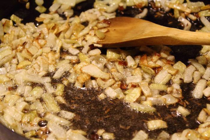 Лук мелко нарезаем и обжариваем до золотистого цвета, под конец добавляем специи.