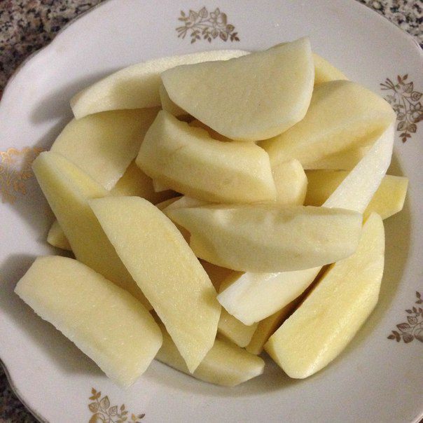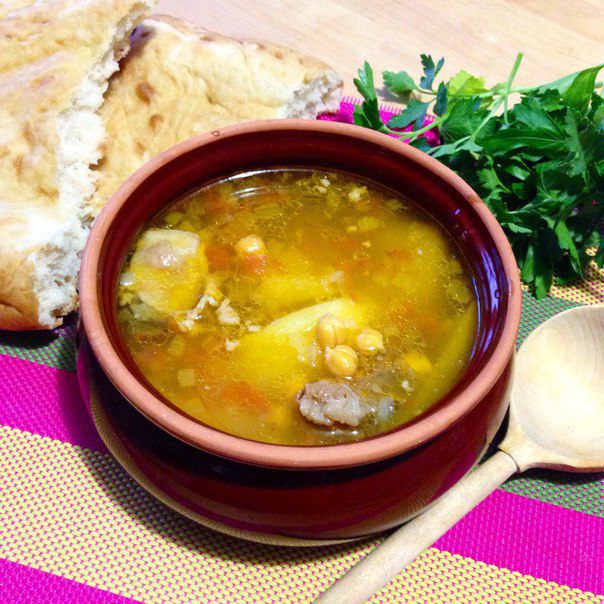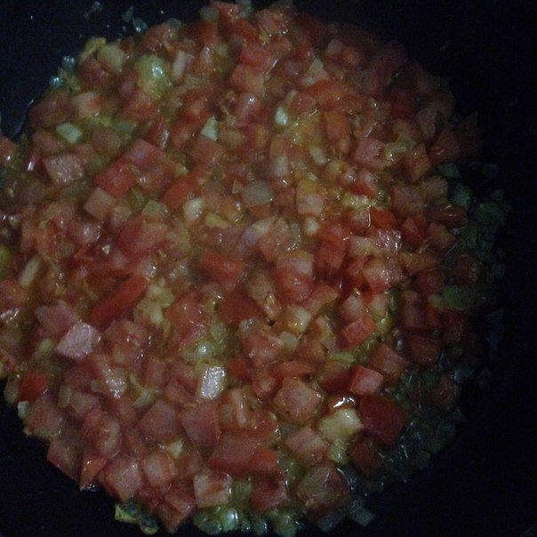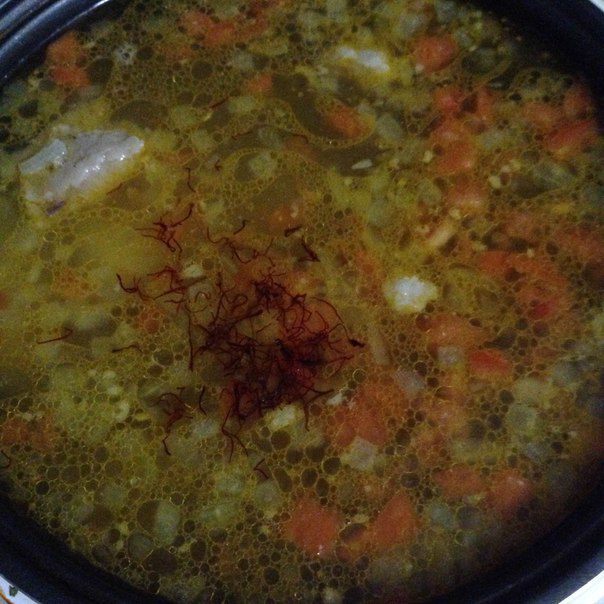 Теперь когда картофель приготовился, кладем отваренный и очищенный нут, пассерованный лук с помидором и щепотку шафрана, все перемешиваем даем закипеть и выключаем.
