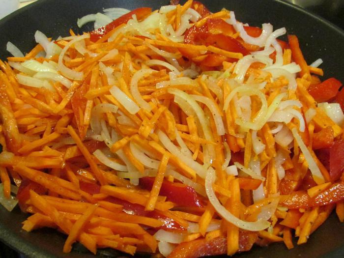 Овощи слегка посолить, добавить сахар и обжарить на другой сковороде, примерно минут 5-7.