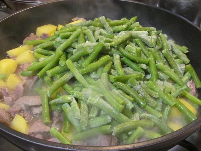 В сковороду добавить стручковую фасоль, снова закрыть крышкой и тушить еще 5 минут.
