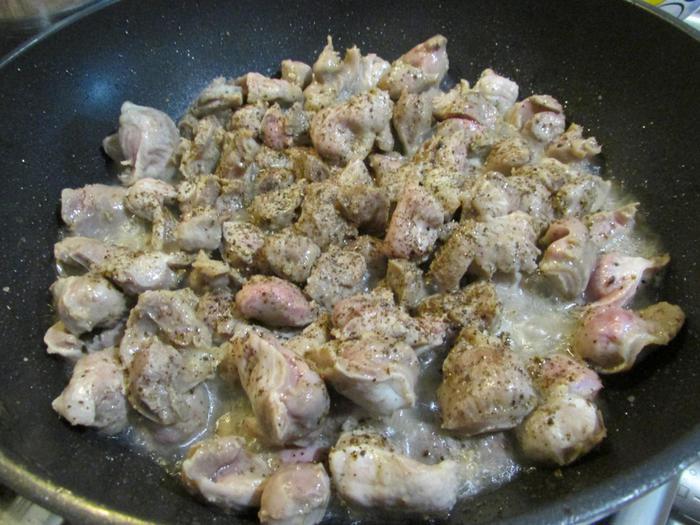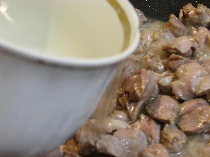 Глубокую сковороду или казан с постным маслом хорошо нагреть. И обжарить на сильном огне желудки в течение 5 минут. Посолить, поперчить.