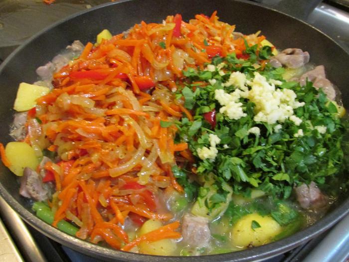 Затем добавить чеснок, петрушку и пережарку, потушить еще 5 минут.