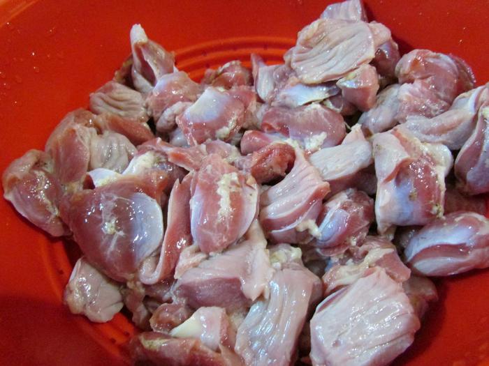 Куриные желудки помыть, удалить жир и грубые пленки. Выложить в дуршлаг, дать стечь воде.