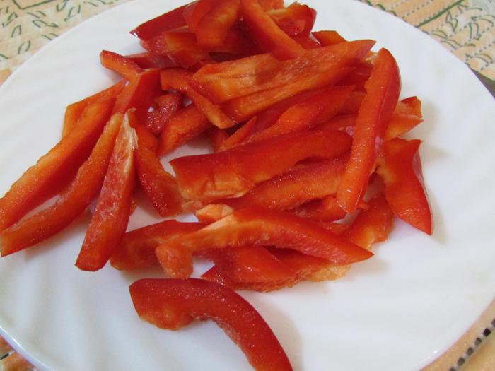 Болгарский перец нарезать соломкой.