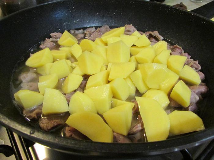 Через 1,5 часа к желудкам добавить картофель. Закрыть сковороду крышкой и тушить до готовности картофеля.