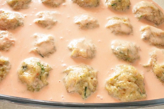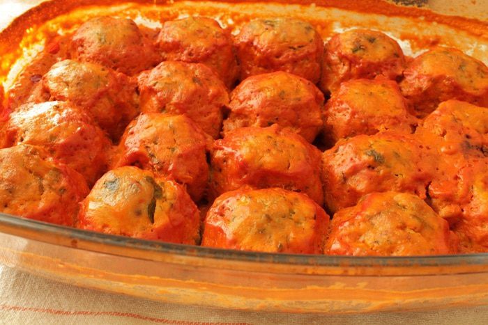 Мокрыми руками сформовать тефтели, выкладываем их в форму для запекания, я готовлю в стеклянной.