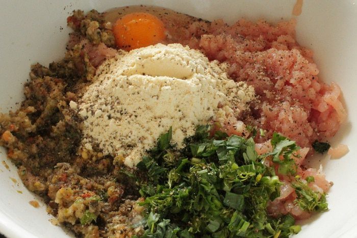 Куриное филе пропустить через мясорубку вместе с обжаренными овощами, добавить яйцо, рубленую зелень (укроп, петрушка, лук), кукурузную муку, соль и молотый перец по вкусу.