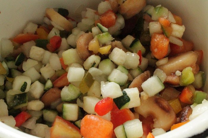 Все овощи и грибы нарезать кубиком. У меня была магазинная замороженная смесь, в состав которой входили овощи и грибы, и я к ней только добавила лук-порей. Все перемешать и обжарить на растительном масле до полного испарения жидкости, примерно 15 минут, остудить.