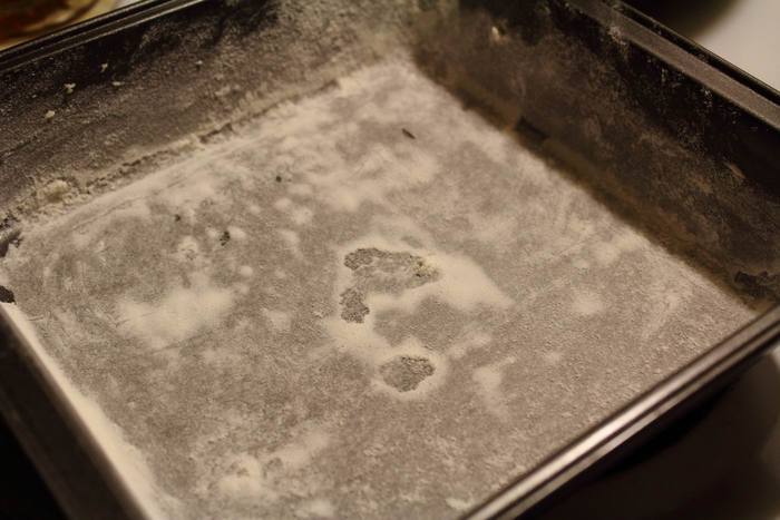 Форму смазать сливочным маслом и обсыпать мукой. Лишнюю муку струсить из формы. Благодаря такой посыпке готовый хлебушек вывалиться очень легко. Лучше, конечно, взять формочку для хлеба-кирпичика, но у меня ее нет пока, потому чуть шире (и потому хлебушек невысокий).