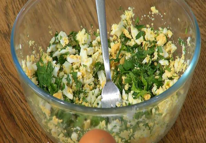 К размятым яйцам добавить половину измельченной зелени, посолить, поперчить и все перемешать.