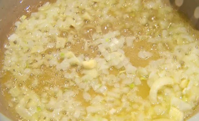 Разогреть в сковороде 1 ч. ложку сливочного масла и оливковое масло и обжарить лук и чеснок до золотистого цвета.