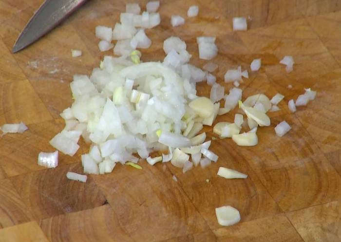 Лук и чеснок почистить и мелко порубить.