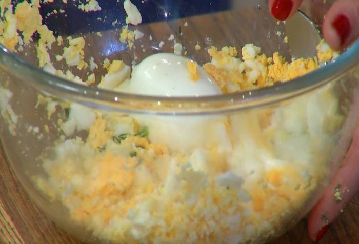 Отварить вкрутую 4 яйца, затем почистить и размять вилкой.