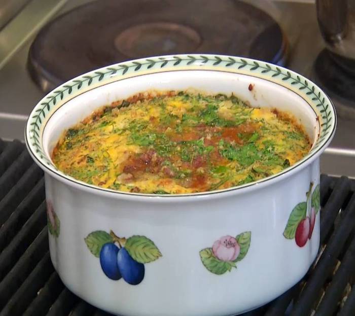 В жаропрочную керамическую форму выложить половину фарша, сверху равномерно распределить размятые яйца с зеленью, затем выложить оставшийся фарш, все разровнять и залить яичной массой.