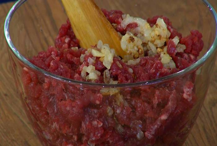 Обжаренный лук с чесноком немного остудить, затем выложить в фарш, посолить, поперчить, влить 100 мл ледяной воды, перемешать, добавить 1 ч. ложку предварительно размягченного сливочного масла и все вымешать.