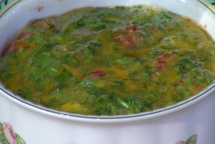 Оставшиеся сырые яйца посолить, поперчить и перемешать с оставшейся зеленью.