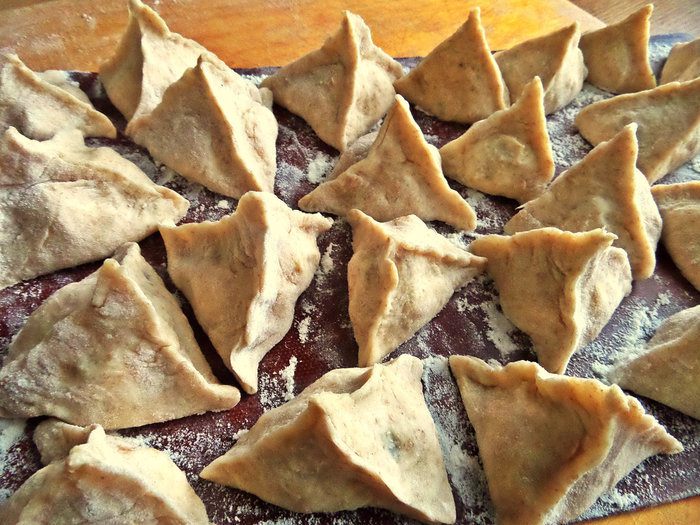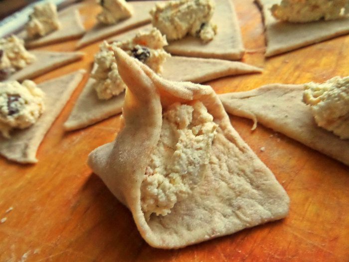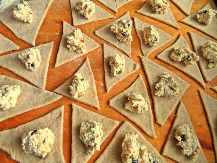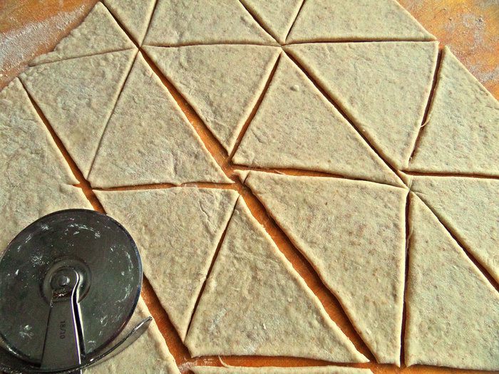 Отделяем кусок теста и раскатываем на припылённой мукой доске тонко, делим ножом для пиццы на треугольники.