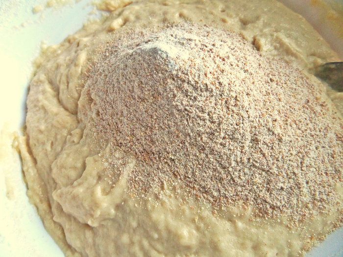 Всыпаем партиями простую муку (муки может уйти до 400 г) и для пользы цельнозерновую, да и вкусно с ней, поверьте. Даём постоять тесту, накрыв полотенцем.