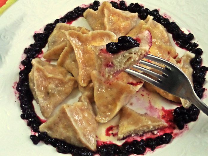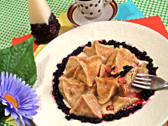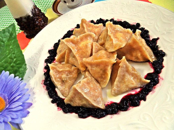 Для подачи наносим по краю тарелки черничное варенье и в центре насыпаем варенички.