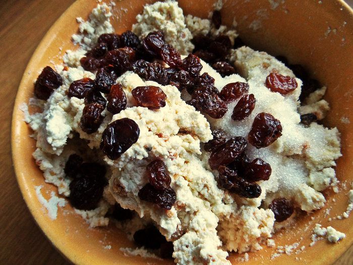 Увидела такую лепку вареников у nata и захотелось приготовить... Добавила от себя муку полезную и крошку в творог, ну а изюм — это классика! Угощайтесь, друзья!