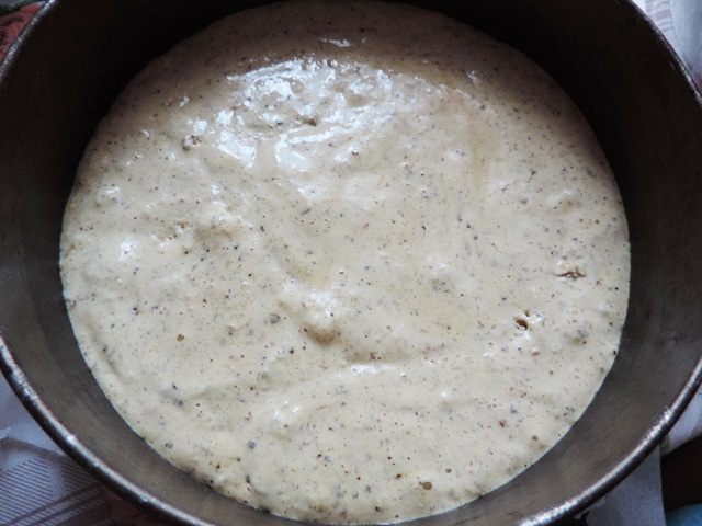 Полученное тесто выкладываем в форму, выстеленную пергаментом. Бока формы ничем не смазываем! У меня разъемная форма диаметром 24 см.