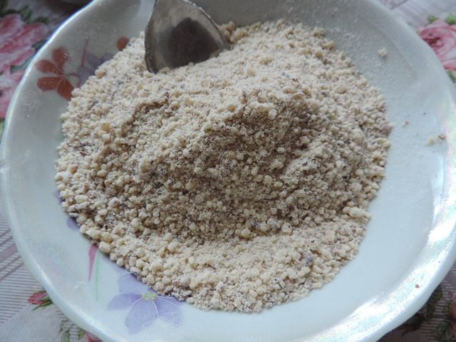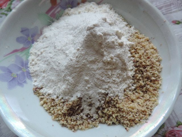 Грецкие орехи измельчить как можно мельче в блендер, мельничка и т.п.