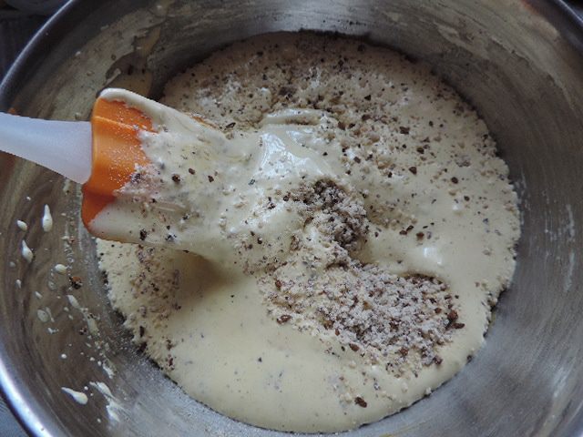 В три приема добавляем к яичной массе орехово-мучную смесь. Аккуратно перемешиваем лопаткой движениями снизу-вверх от краев к центру.