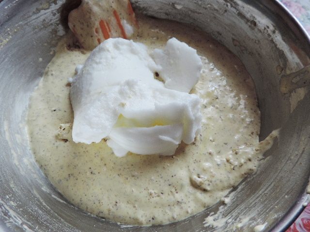 В два приема вводим взбитые белки. Аккуратно перемешиваем лопаткой движениями снизу-вверх от краев к центру.