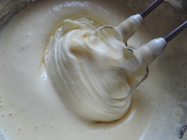 Яйца, желтки и сахар взбиваем до получения пышной светлой однородной массы. Она должна увеличиться в 2-3 раза. Взбиваем больше 5 минут.