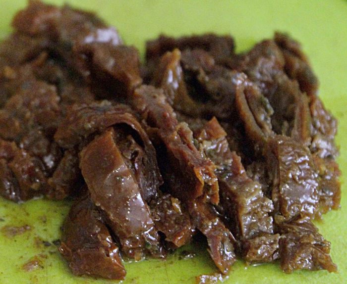 Вяленые помидоры порезать на небольшие кусочки.