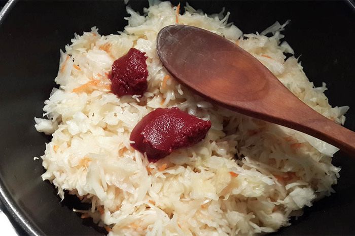 Пока приготовить начинку: капусту потушить с маслом минут 15. В конце добавить томатную пасту. Хорошо размешать. Чтобы мешать было удобнее, можно сначала развести пасту с горячей водой (1-2 ст. ложки). Остудить.