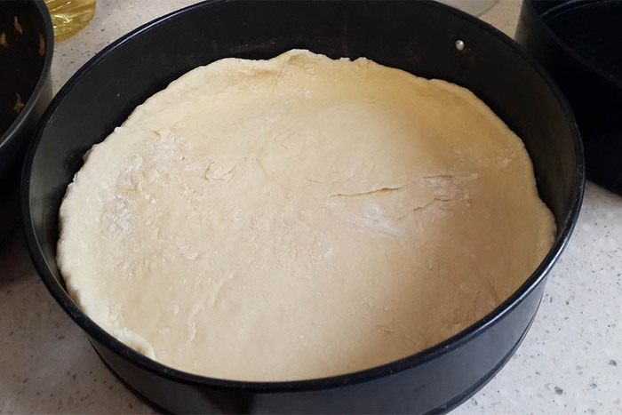 Отложить треть теста для верха. Остальное раскатать и выложить в разъемную форму, покрытую пергаментом. Сделать бортики.