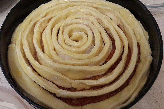 Выложить начинку. Украсить оставшимся тестом. Для этого раскатать тесто и нарезать на полоски. Скрутить, начиная от центра, по спирали. Смазать желтком с сахаром, взбитыми вилкой. Выпекать около 45-50 минут.