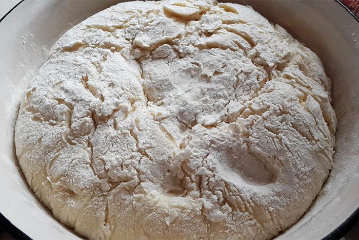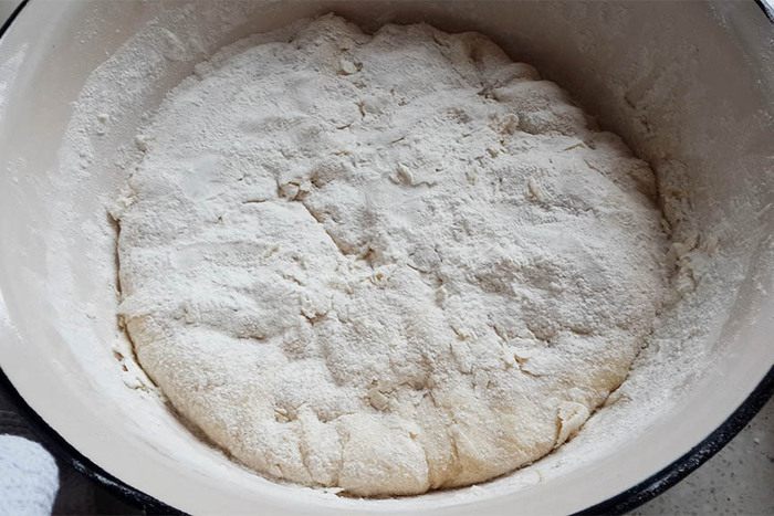 Накрыть миску полотенцем и поставить в теплое место. Через 1-1,5 часа тесто увеличится примерно в 2-2,5 раза. Обмять его и поставить еще в теплое место.