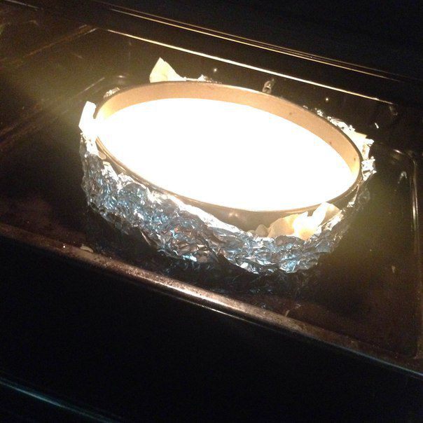 Теперь берем форму с тестом и оборачиваем её фольгой из двух слоев с низу и по бокам, так как мы будем выпекать чизкейк как бы на пару, чтобы при выпекании вода не попала и наше тесто не намокло.