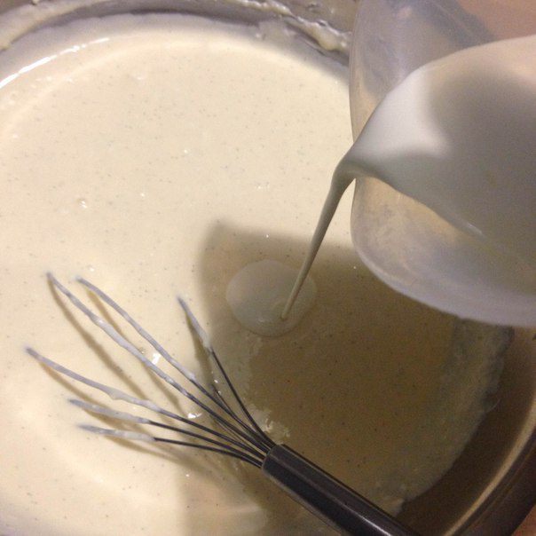 Аккуратно переливаем крем в форму с коржом ставим на противень и располагаем противень по середине духовки и наливаем на противень воду почти до краев. Выпекаем при 160°C 1 час 20 минут, но нужно за ним присматривать все зависит от вашей духовки, но на час минимум.