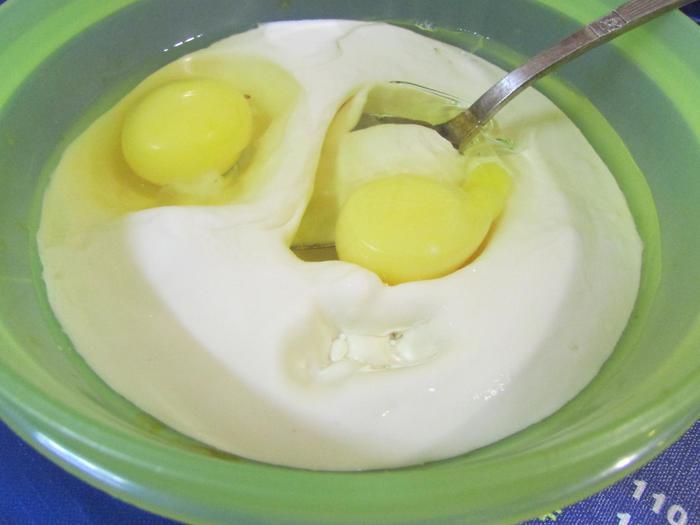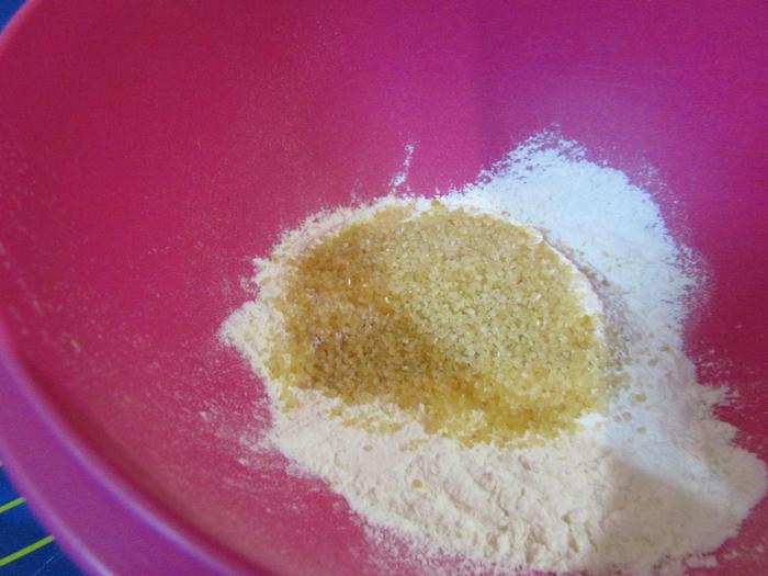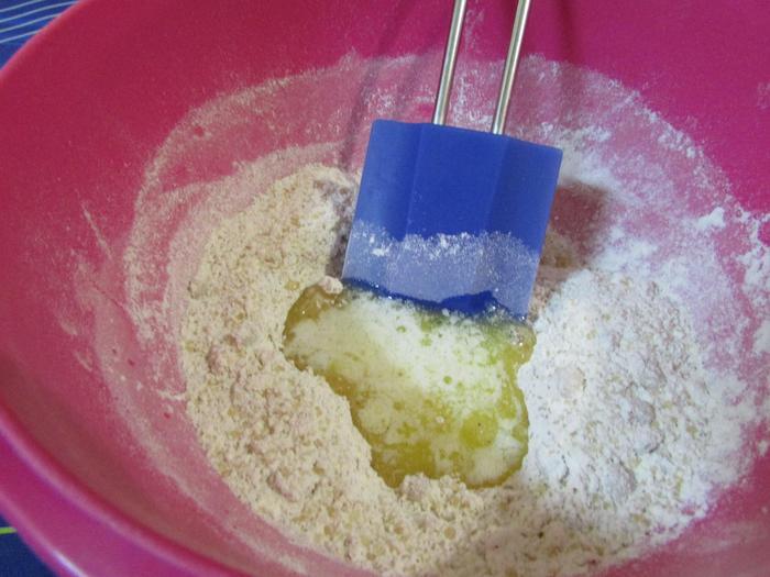 Сливочное масло растопить. Дать остыть и влить в мучную смесь.