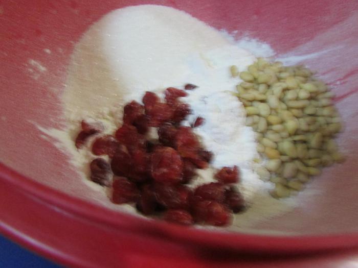 Приготовить тесто. В миску просеять муку и разрыхлитель. Добавить орехи и вяленую вишню. Перемешать.